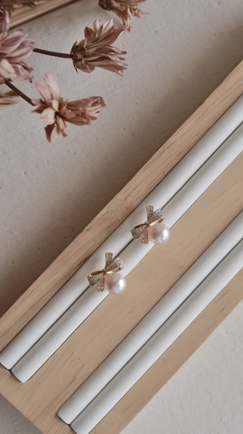 奶油釉面蝴蝶結珍珠耳環